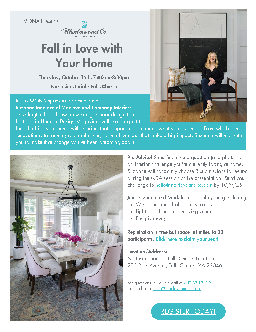 Suzanne Manlove of Manlove and Company Interiors, an Arlington-based, award-winning design firm, will share expert tips for refreshing your home with interiors that support and celebrate what you love most, From whole-house renovations, to room-by-room refreshes, to small changes that make a big impact, Suzanne will motivate you to make that change you've been dreaming about.