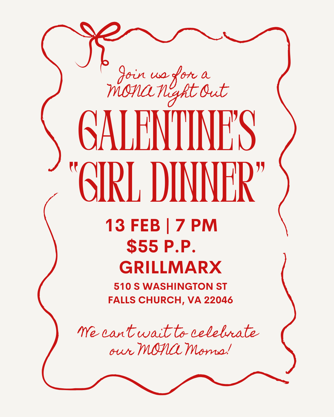 Event Details: Join MONA for a fun and festive Galentine’s Girl Dinner on Friday, February 13th at the new Falls Church restaurant GrillMarx! This moms-only night out is all about great food, easy conversation, and celebrating friendship—no planning, no cleanup, just showing up and enjoying the evening with your Galentines!